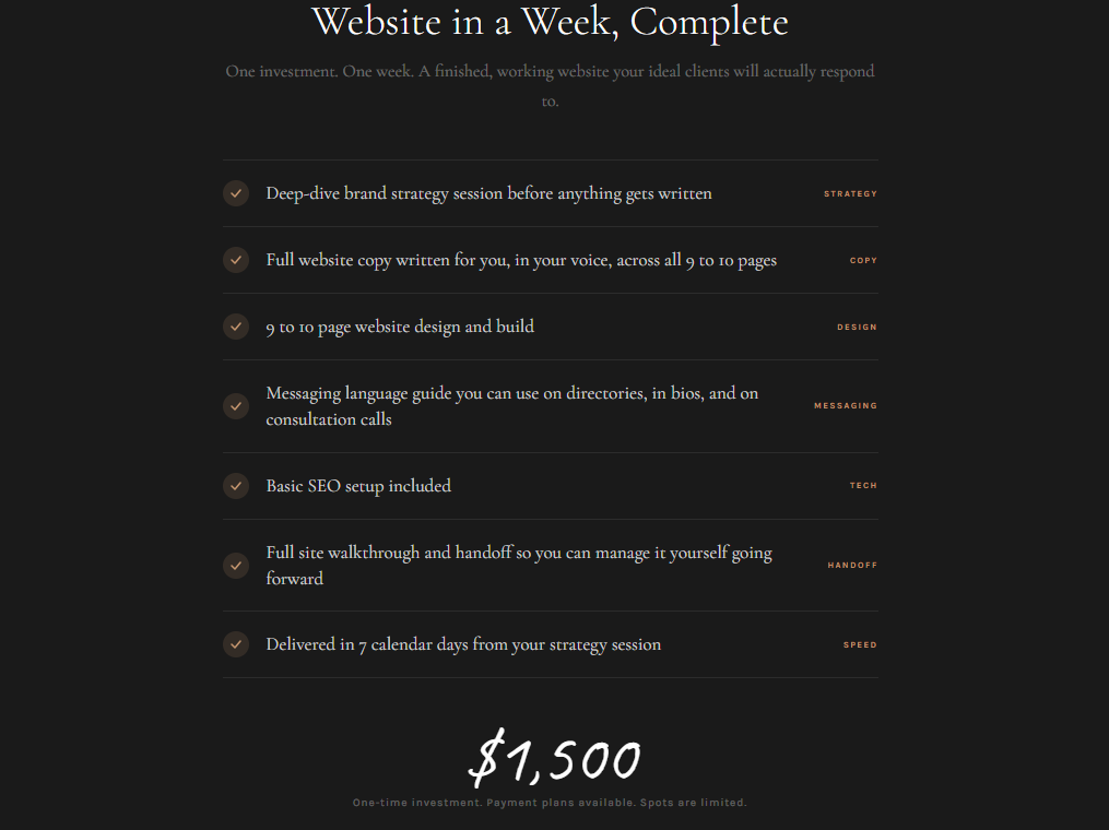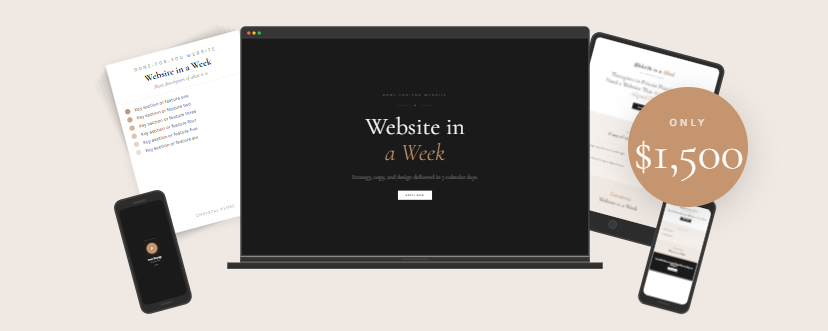 Get Website-in-a-Week for $1,500. Strategy session, full copy, 9 - 10 page design and build, and complete handoff in one week.