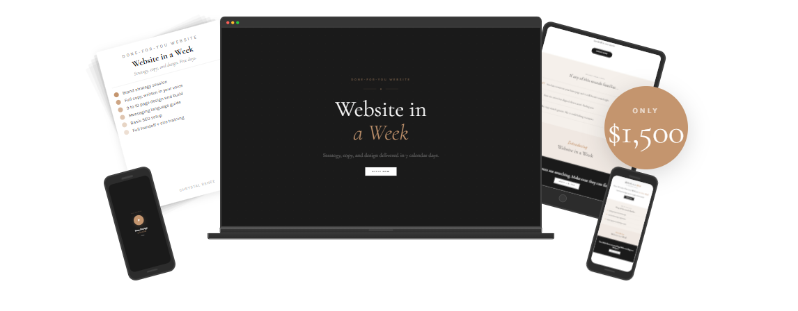 You will be sent a questionnaire. Once complete and we feel this is a good program for you, you will review and sign the project contract. Day one is your brand strategy session. Days two and three, I write the copy, design the home page and send it to you for review. Days four and five, I build and design the rest of the site based on your approval of home page design. Once full site build is complete, it will be sent to your for review and you will be able to submit 1 round of edits. By end of week, you have a complete, live website and a walkthrough so you know how to manage it going forward.